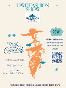 Step into a vibrant afternoon of style and community with the Democratic Women of the Desert as we kick off the new year at the beautiful Desert Willow Golf Resort. Enjoy a delicious lunch, take in the stunning high‑fashion designs of Trina Turk, and soak up the lively, welcoming atmosphere that makes this event a beloved annual tradition. Tickets are just $50 and include full access to the show and lunch. This chic, creative, community‑powered celebration is one you won’t want to miss! Grab your tickets and RSVP now so you can be part of the fun!