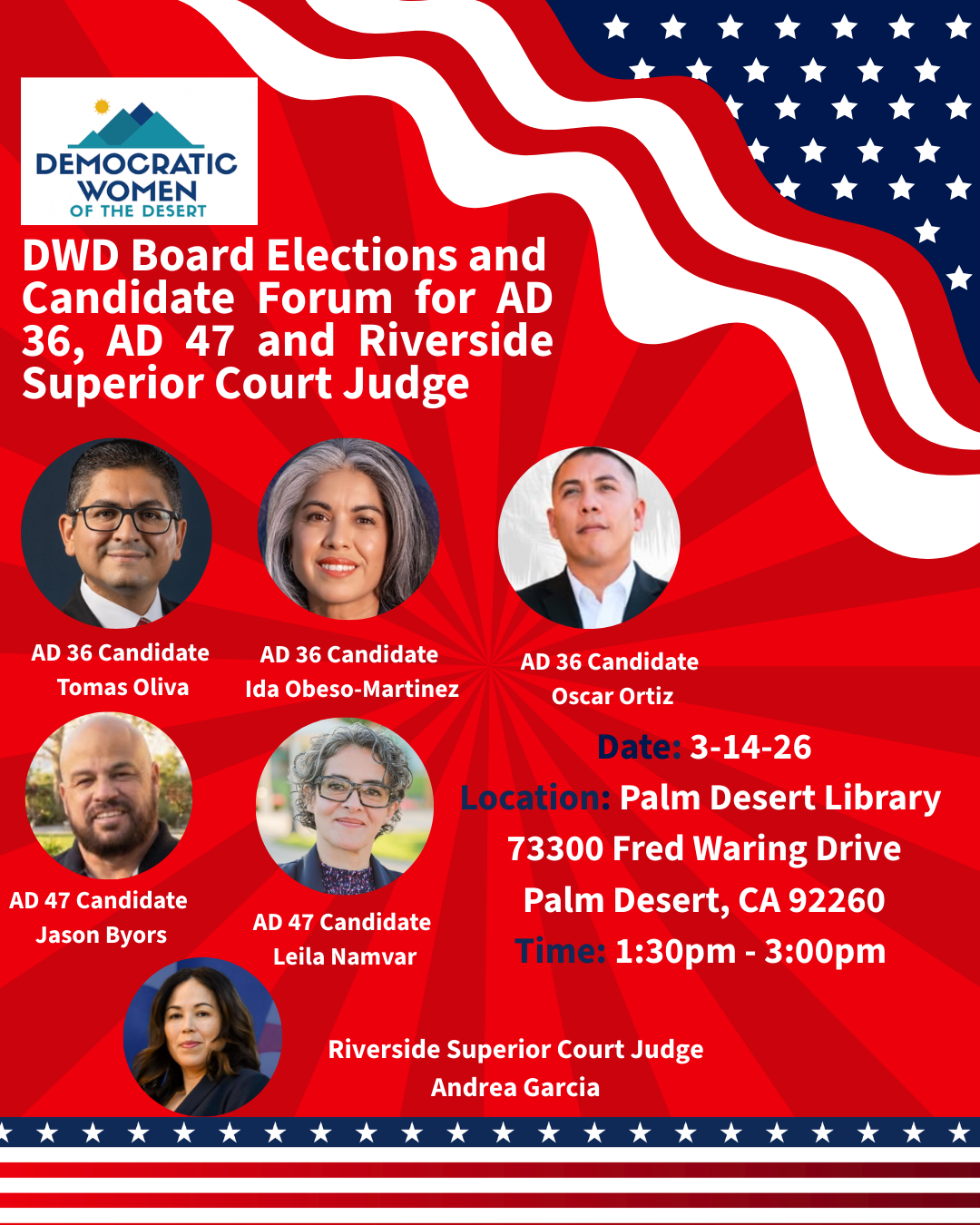Join us for an important afternoon of civic engagement! On March 14, we will host our DWD Board Elections along with a Candidate Forum featuring candidates running for California Assembly Districts 36 and 47, as well as Riverside Superior Court Judge. This is a great opportunity to hear directly from the candidates, learn about the...